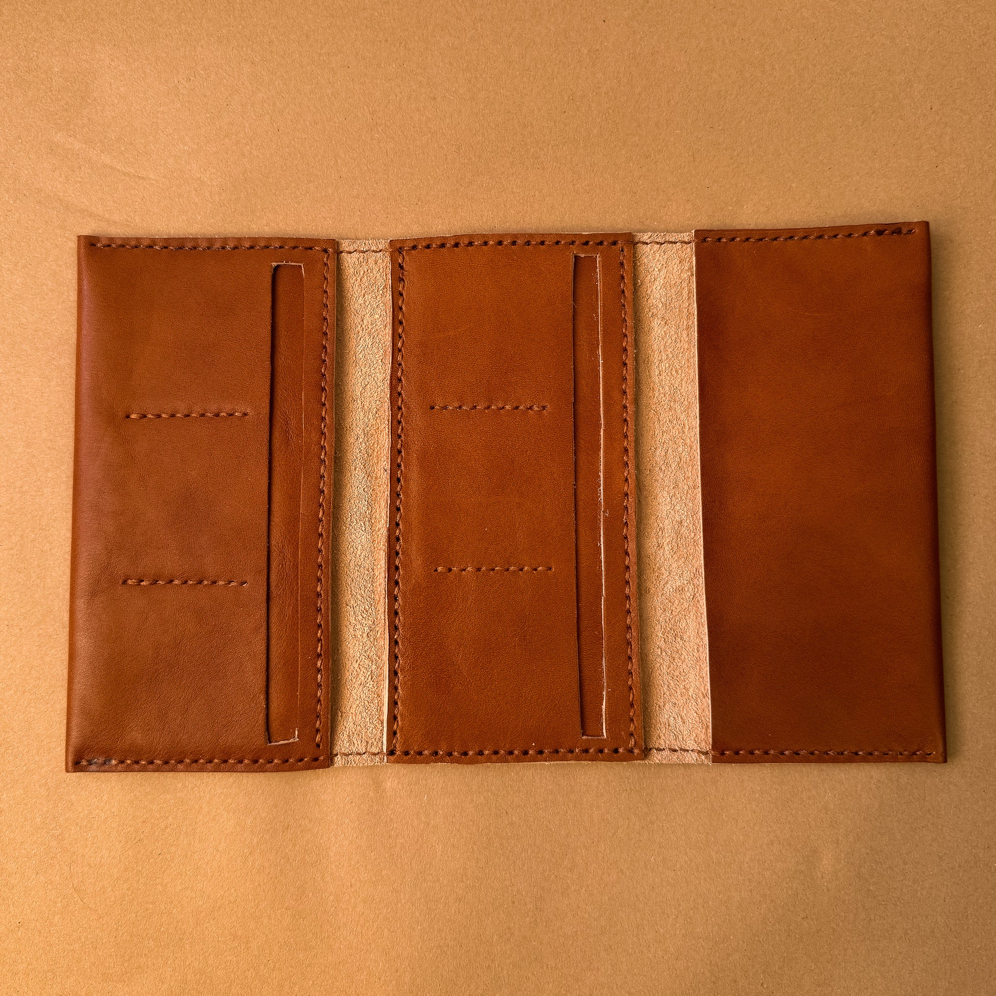 This women’s wallet is hand-stitched from full-grain cognac leather, built for everyday use and made to age beautifully over time. When closed, it measures 4 × 7.5, offering a tri-fold design that holds several cards while keeping everything organized and secure. Multiple compartments for cash add function without unnecessary bulk. Simple, durable, and thoughtfully made, it’s a wallet meant to be carried daily and trusted for years.