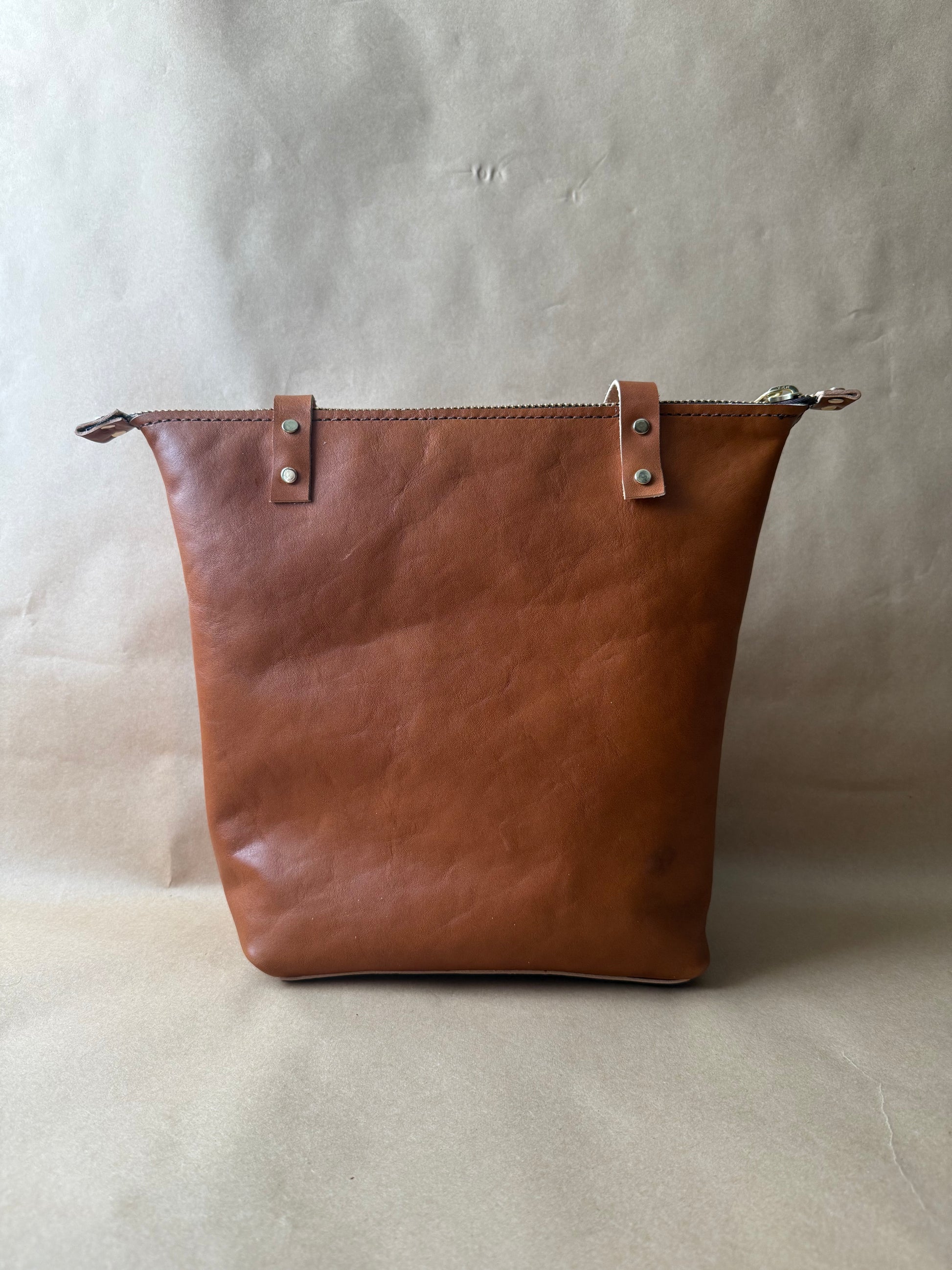 This compact leather tote is built for everyday use, without cutting corners. Made from rich cognac full-grain leather, it will soften and develop character the more it’s carried.